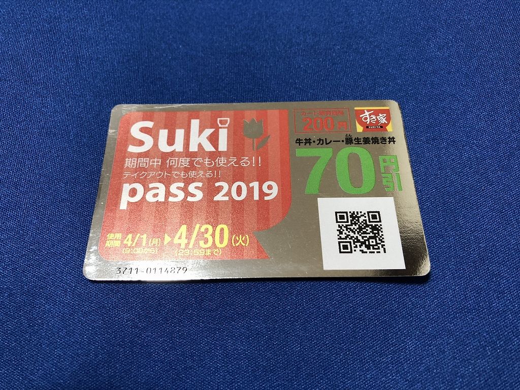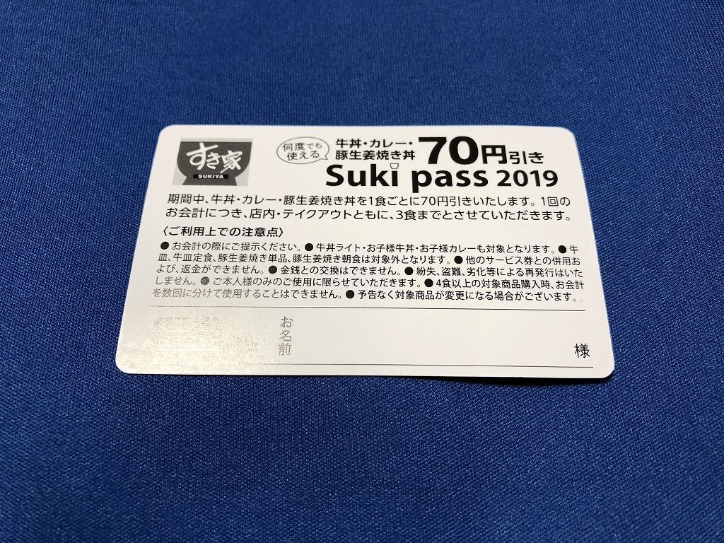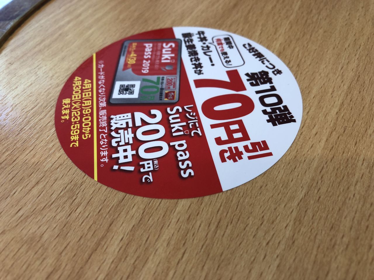 「Sukipass」とは、会計時に提示することで、店内でも持ち帰りでも牛丼・カレー・豚生姜焼き丼が70円引きになるカード。