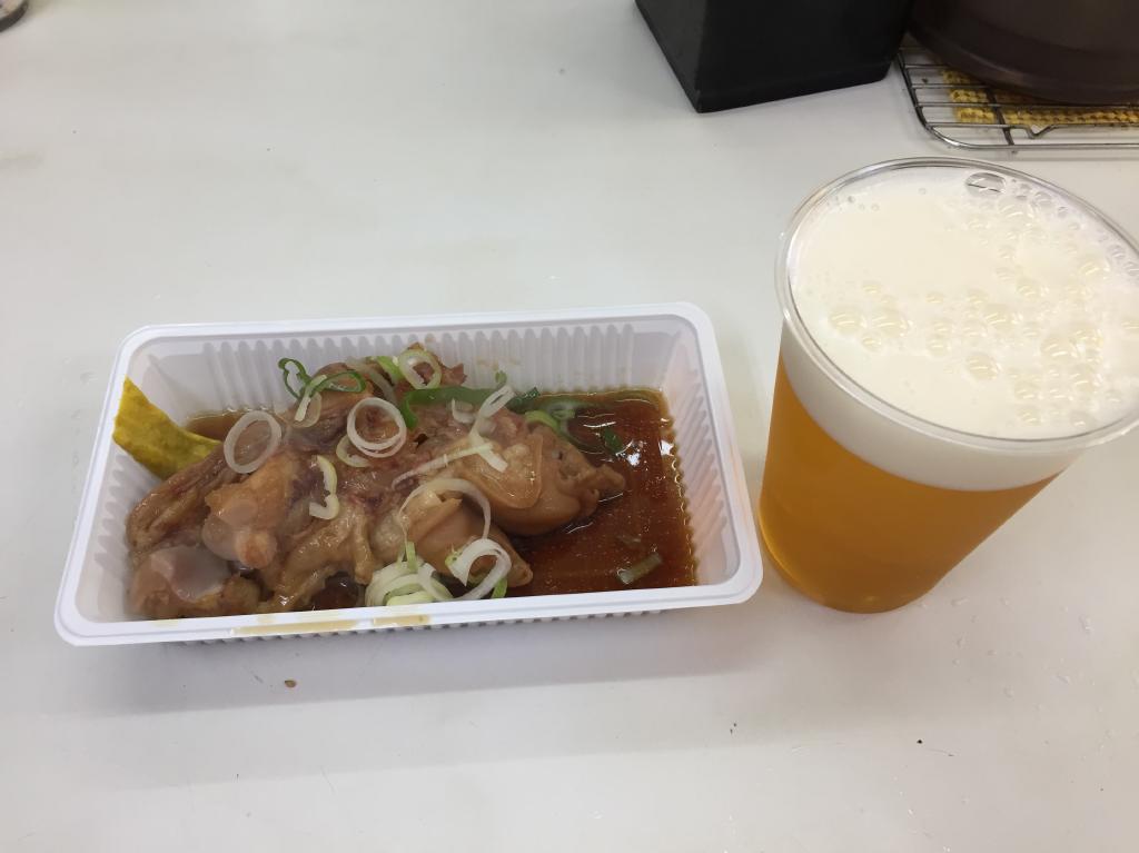 まずは、生ビール(220円)と所望していた「豚足煮込み」(220円)を注文します。そうすると、すぐに鍋から豚足煮込みをよそってくれて、生ビールとともに目の前に出てきました。