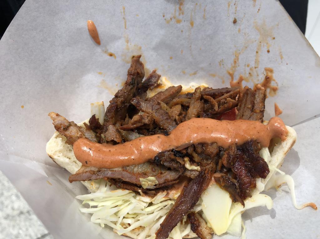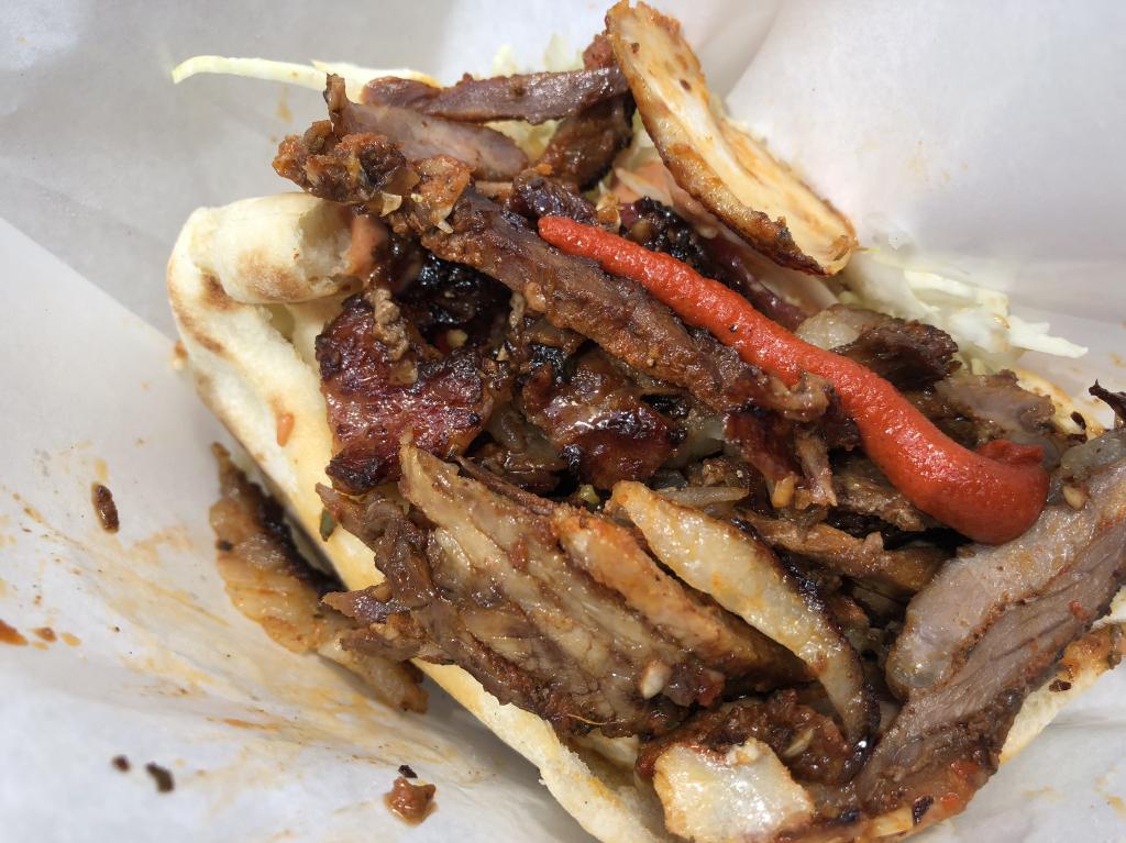 そしてピタパンにキャベツの千切りを入れ、それぞれの肉を入れていき、最後にソースをかけていきます。