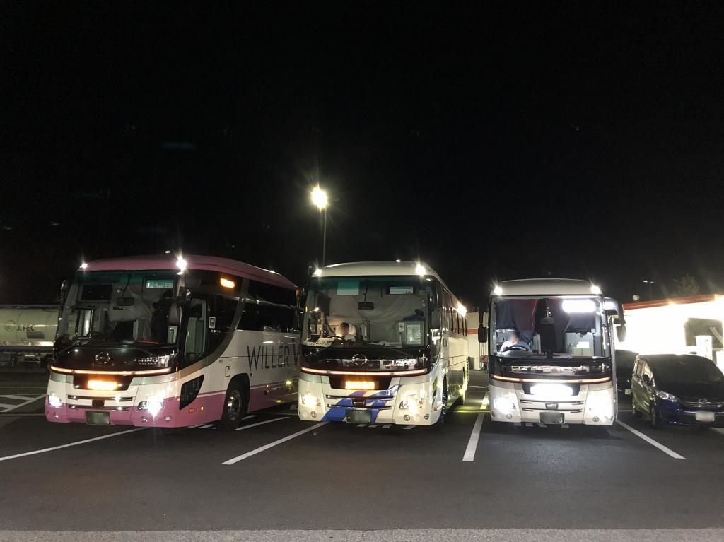 ここは深夜の高速バスの休憩地点になっており、いろいろな会社のカラフルなバスも停車しています。